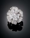 Realizado en platino, diseño floral en forma de camelia cuajado de diamantes talla brillante y 8/8 engastados en pavé, con un peso total aproximado de 2,235 cts. Faltan dos diamantes.