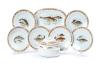 Set en porcelana esmaltada de Limoges para pescado con decoración de peces en el campo y alero de rico colorido vegetal y floral. Con marcas.