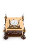 Caja en madera, remate de pináculos rematados en cabujón de rubíes. Esfera con numeración romana. firmado. Decoración de lazos y guirnaldas con aplicaciones de perlitas.