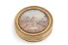 Con tapa pintada a mano bajo cristal orlada con vidrios de color. Trabajo guilloché y greca relevada floral. Con marcas.