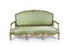 En madera tallada, dorada y pintada. Compuesto por sofá y dos butacas con tapicería en seda adamascada verde.