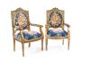 Formado por sofá y dos sillones. En madera tallada y dorada con decoración de hojas de acanto y remate de motivos florales en copete, patas troncocònicas acanaladas. Tapicería estampada de flores y de frutas.