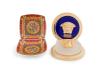 Lote formado por dos pomos para puerta en vidrio azul cobalto con medusa y perfil en dorado, y dos ceniceros en porcelana esmaltada y policromada.