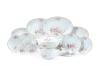 Compuesta por: 22 platos llanos, 13 platos hondos, 10 platos de postre, 1 sopera, 1 ensaladera, 4 fuentes ovales de distintos tamaños, 2 rabaneras, 1 salsera y 1 jarrita. Completan el juego 9 platitos en porcelana con decoración floral de similiar diseño.